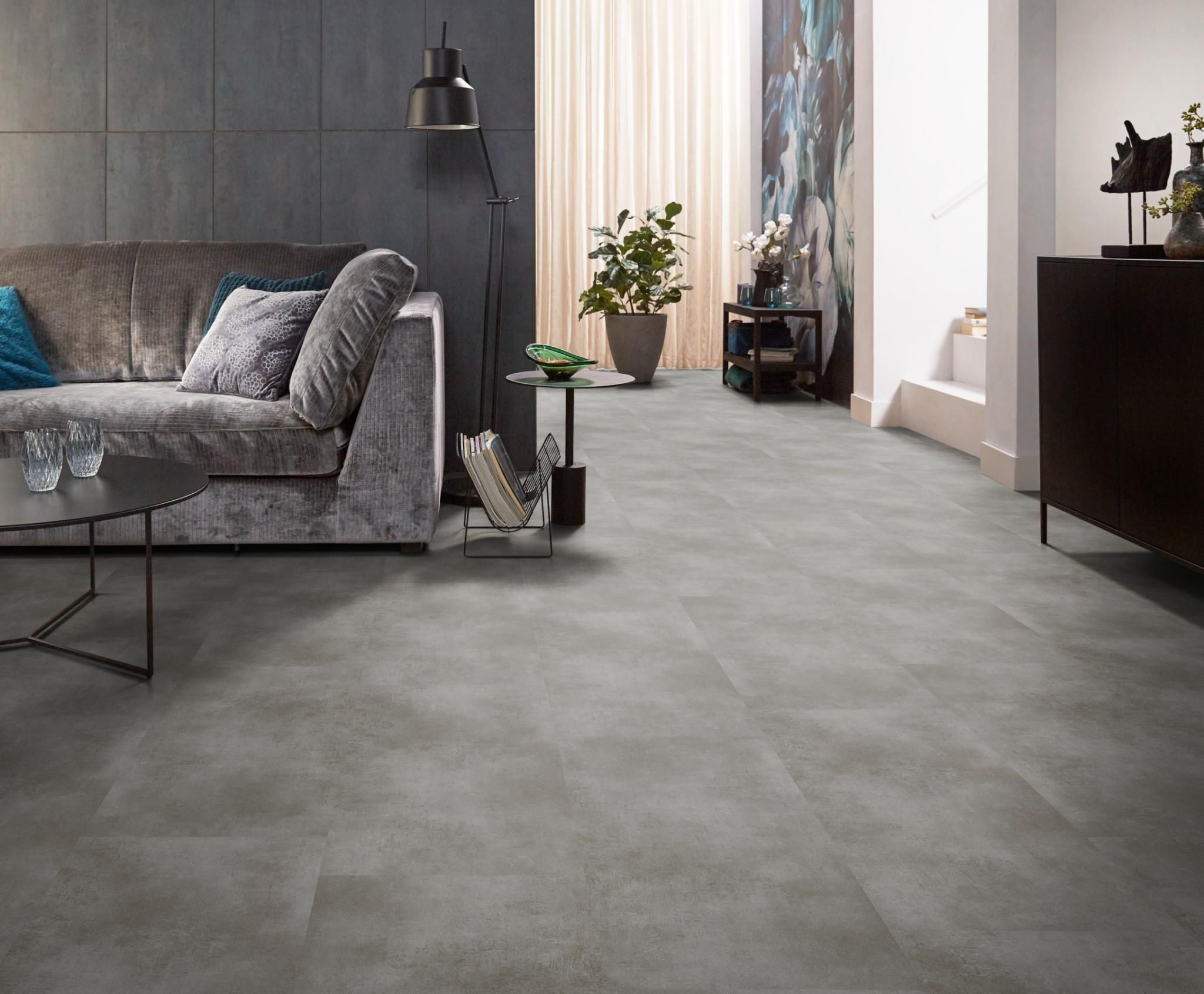 De moderne en strakke uitstraling van deze betonlook vloer in extra grote uitvoering, namelijk pvc-tegels van 91cm bij 91cm. Met deze uitvoering creëert u een ruimtelijk effect in uw interieur. De tegels zijn waterbestendig en mede daardoor zeer gemakkelijk in onderhoud. Met de sterke toplaag van 0.55mm heeft u jarenlang plezier van dit tijdloze dessin.