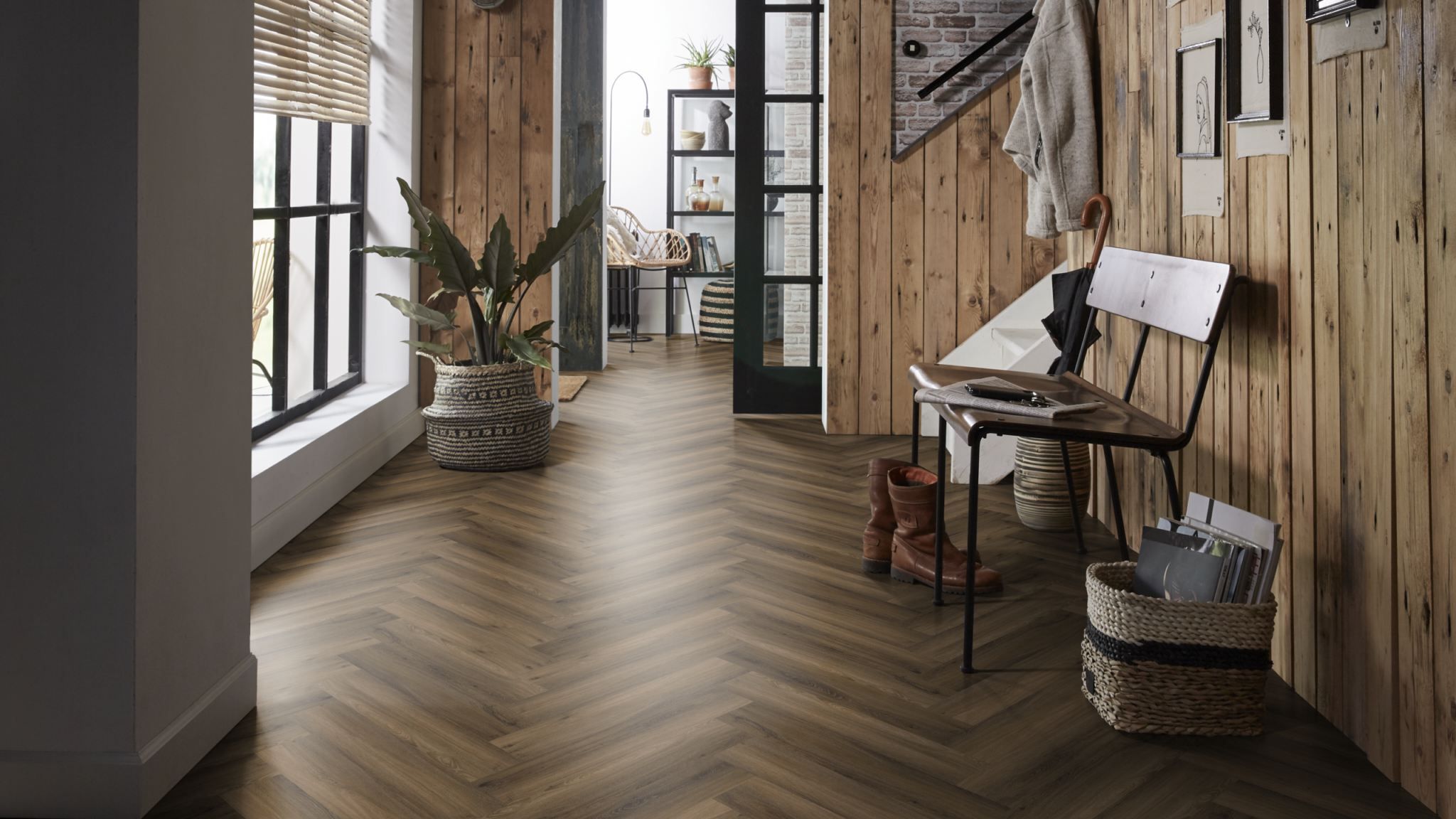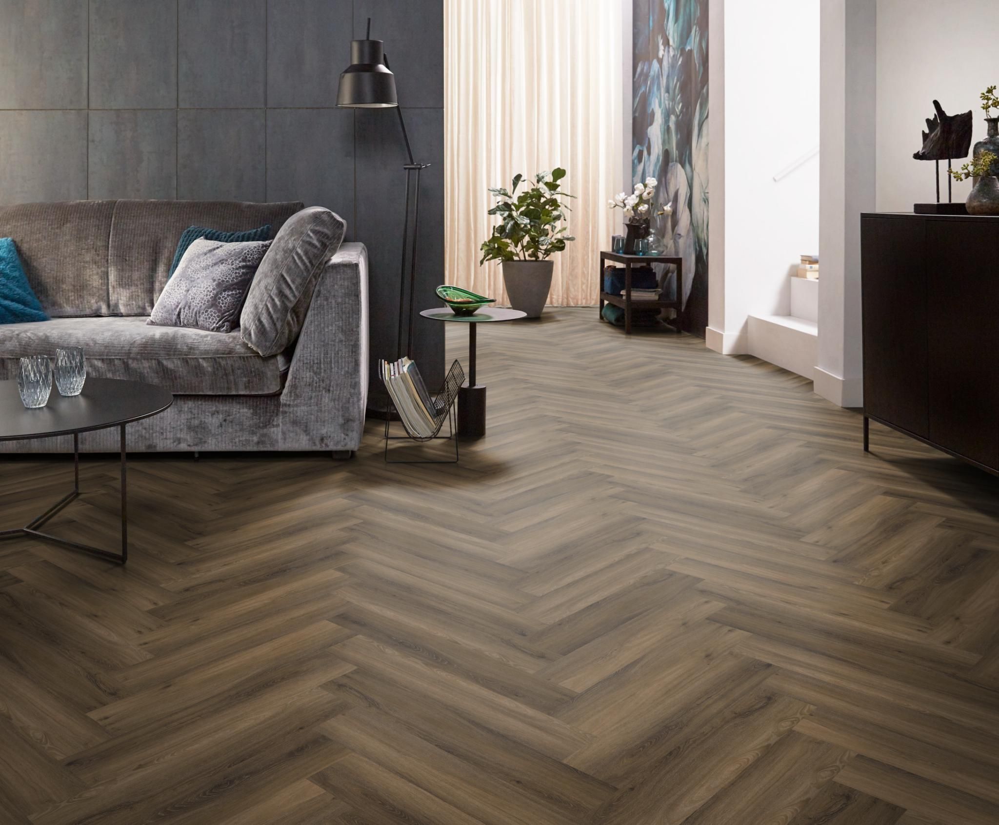 De moderne uitstraling van visgraat-pvc in karakteristieke uitvoering. Deze vloer is nauwelijks van echt hout te onderscheiden, door de kleine noesten. Deze vloer is 7 mm dik en heeft een toplaag van 0.55mm. deze vloer is ook geschikt voor appartementen vanwege 10dB deltaL in geluidsreductie.